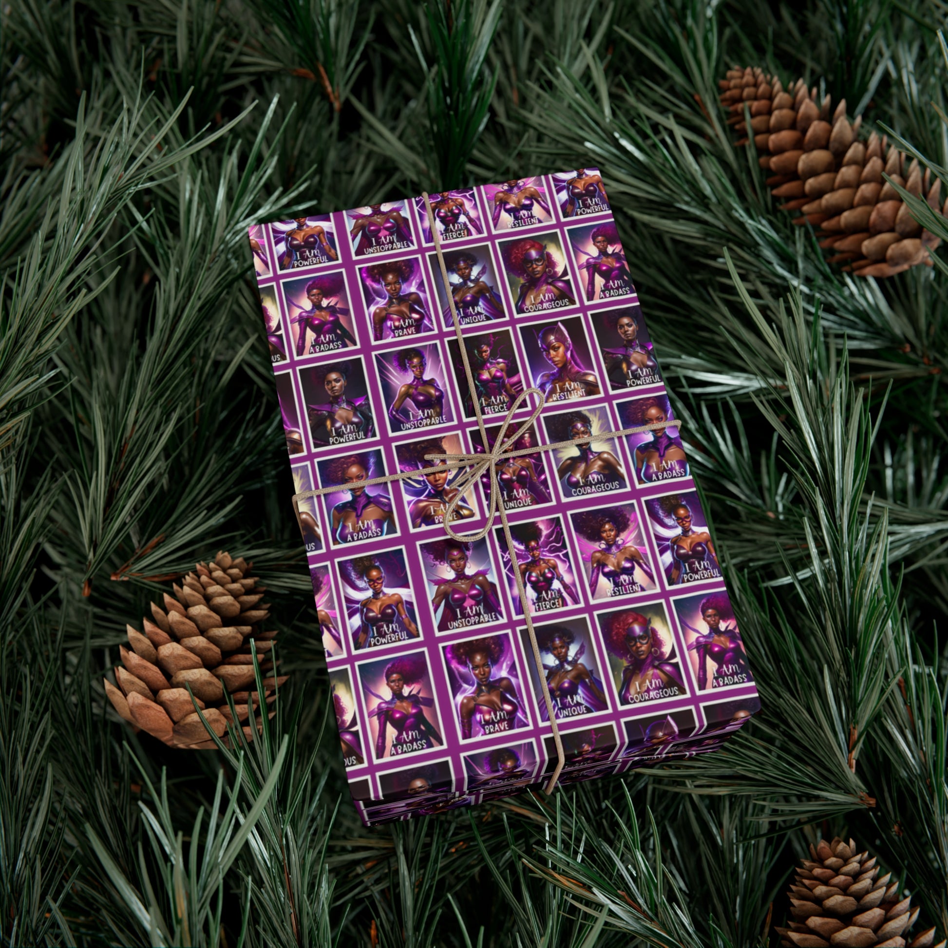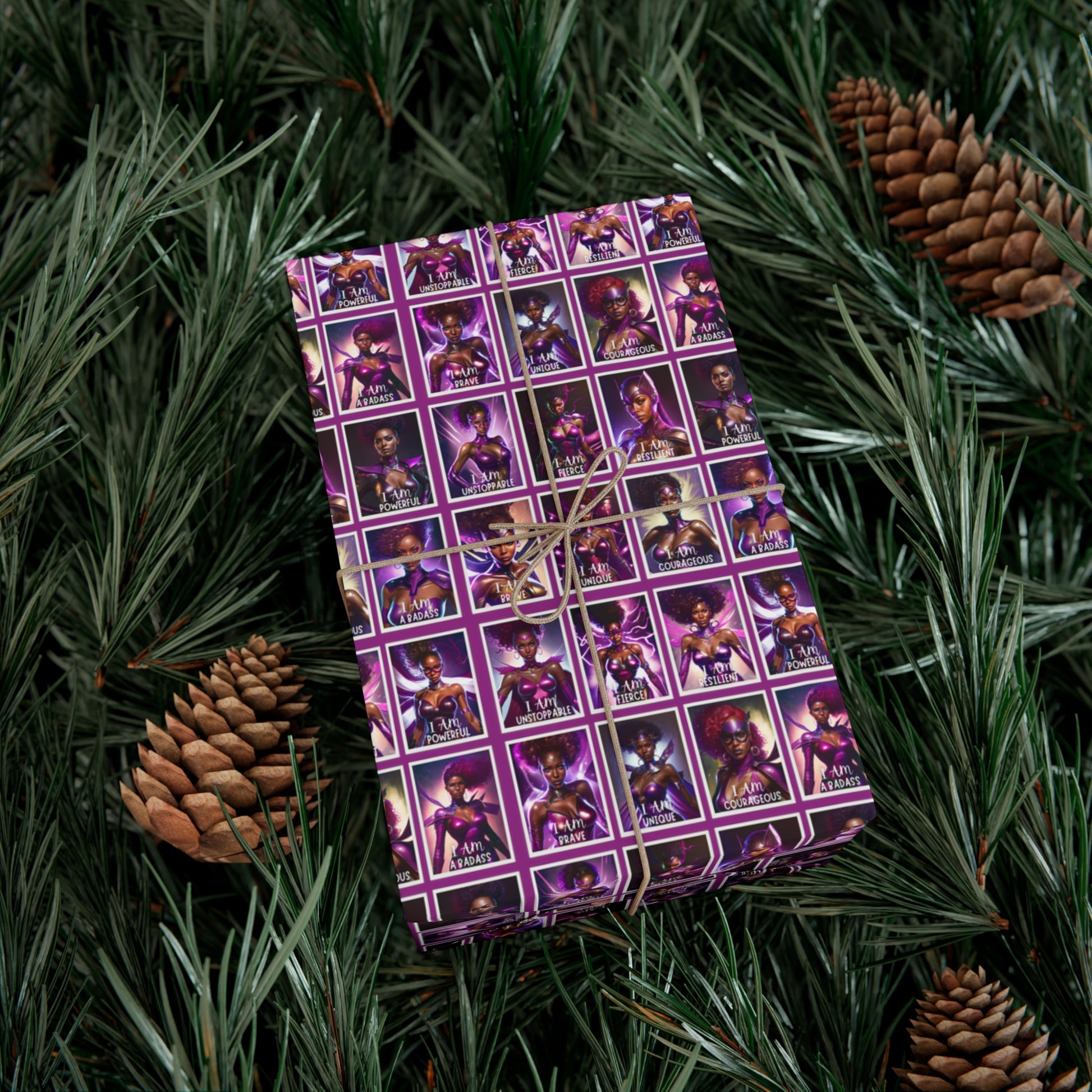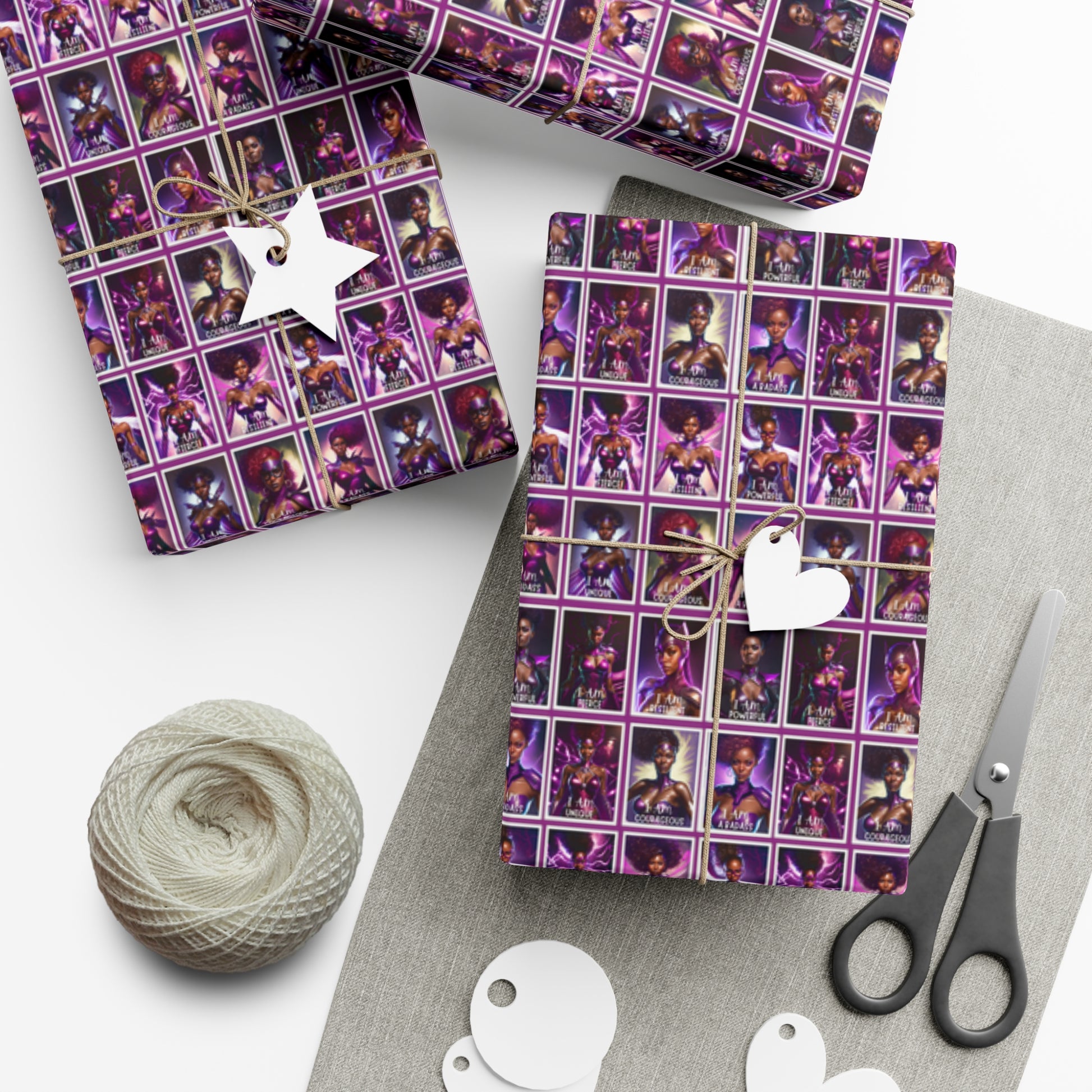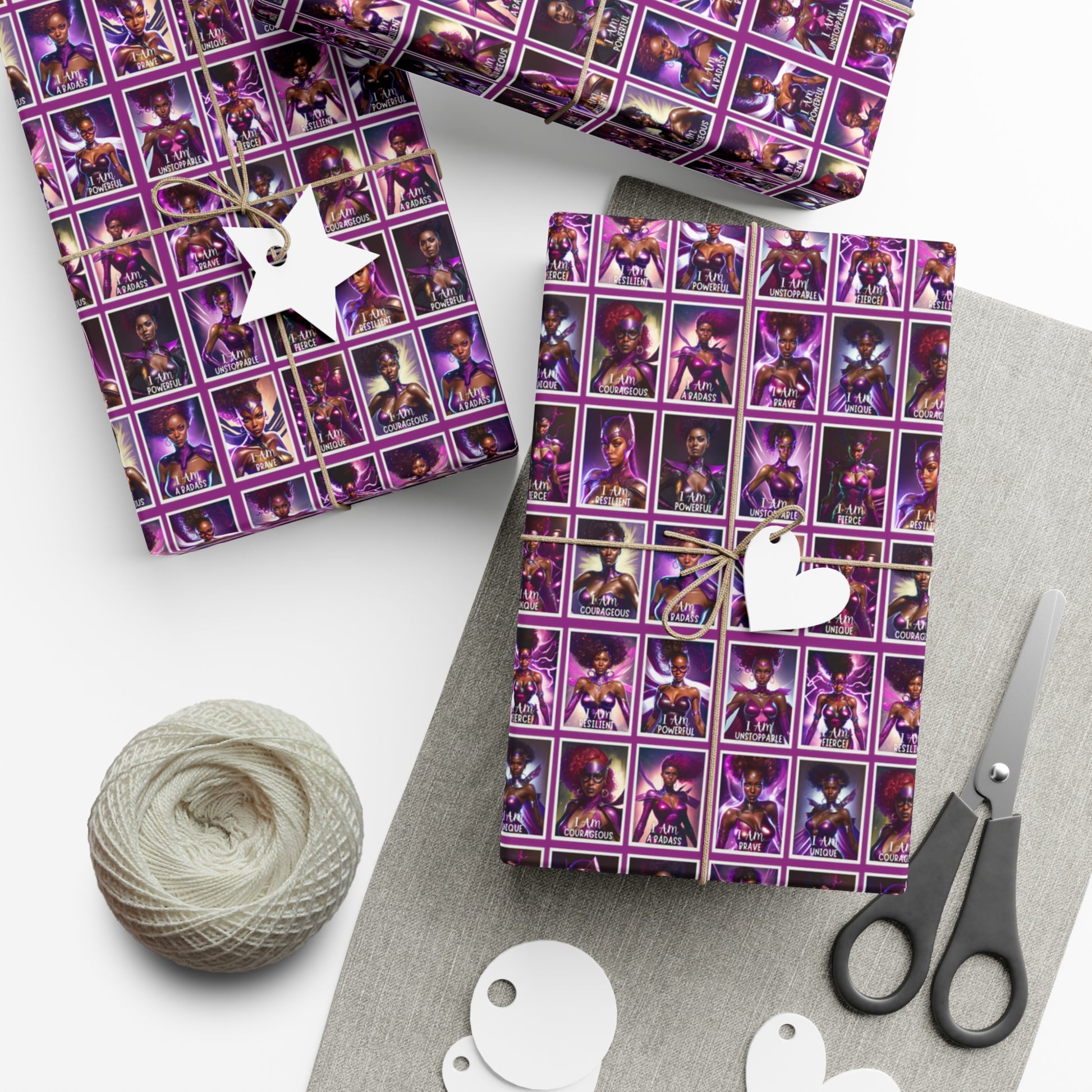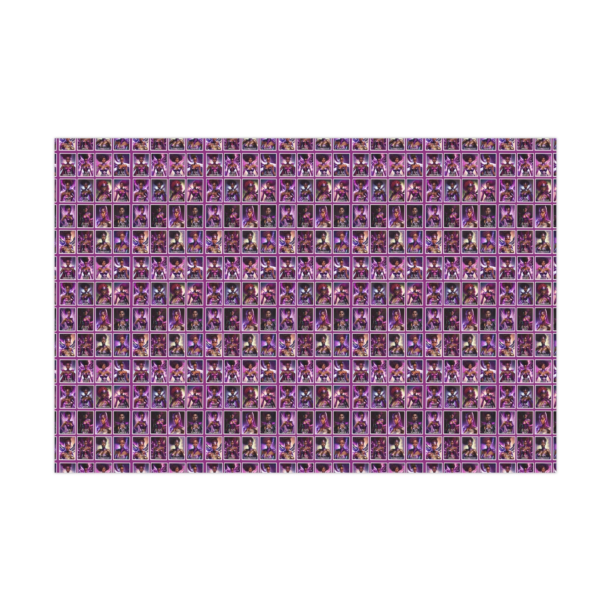 Available in two stunning paper finishes, satin and matte, this gift wrap paper ensures that your presents make a lasting impression. Each sheet features vibrant images of 16 badass Black women superheroes, accompanied by empowering affirmations that inspire greatness. From "I am unstoppable" to "I am a Badass," these affirmations send a powerful message of strength and resilience.