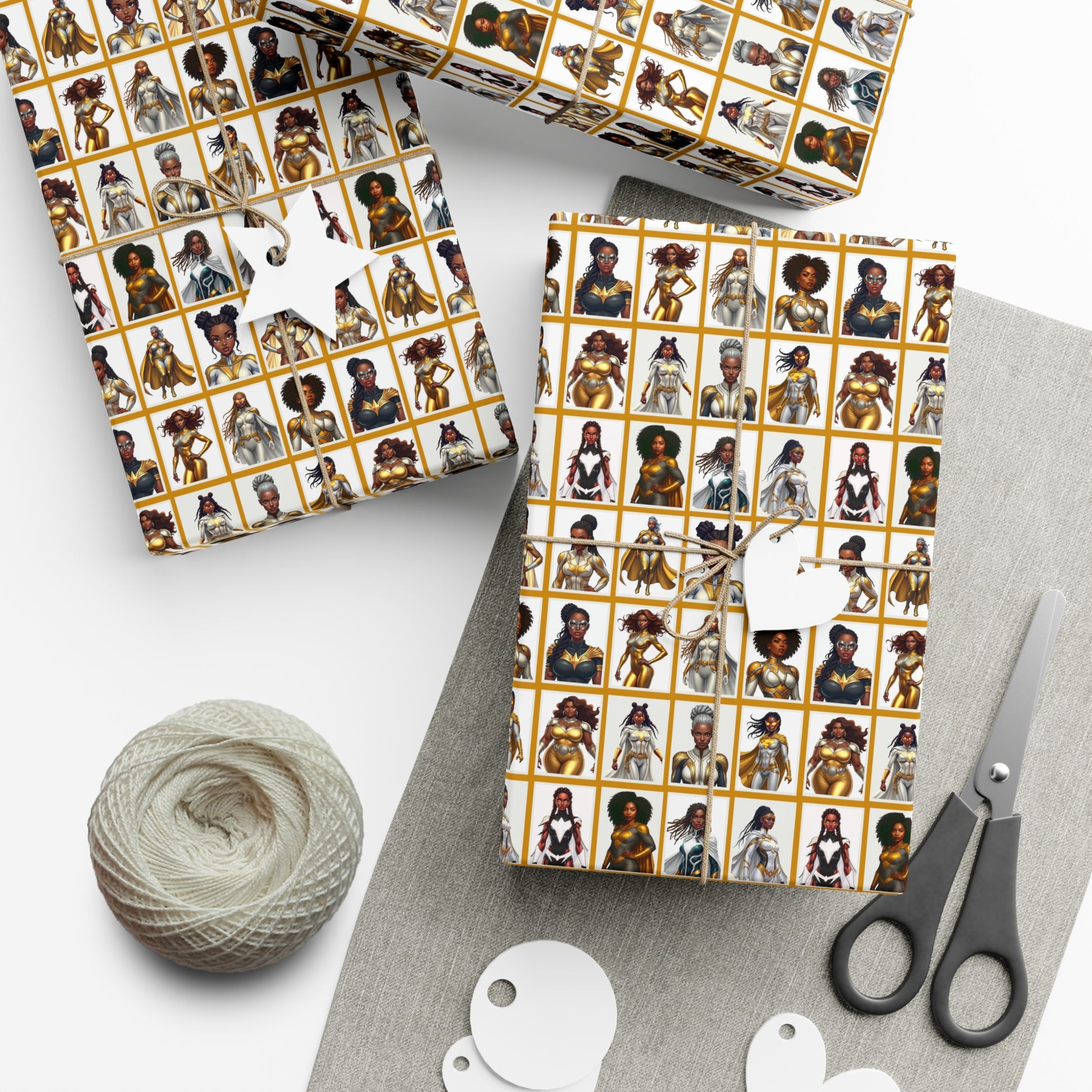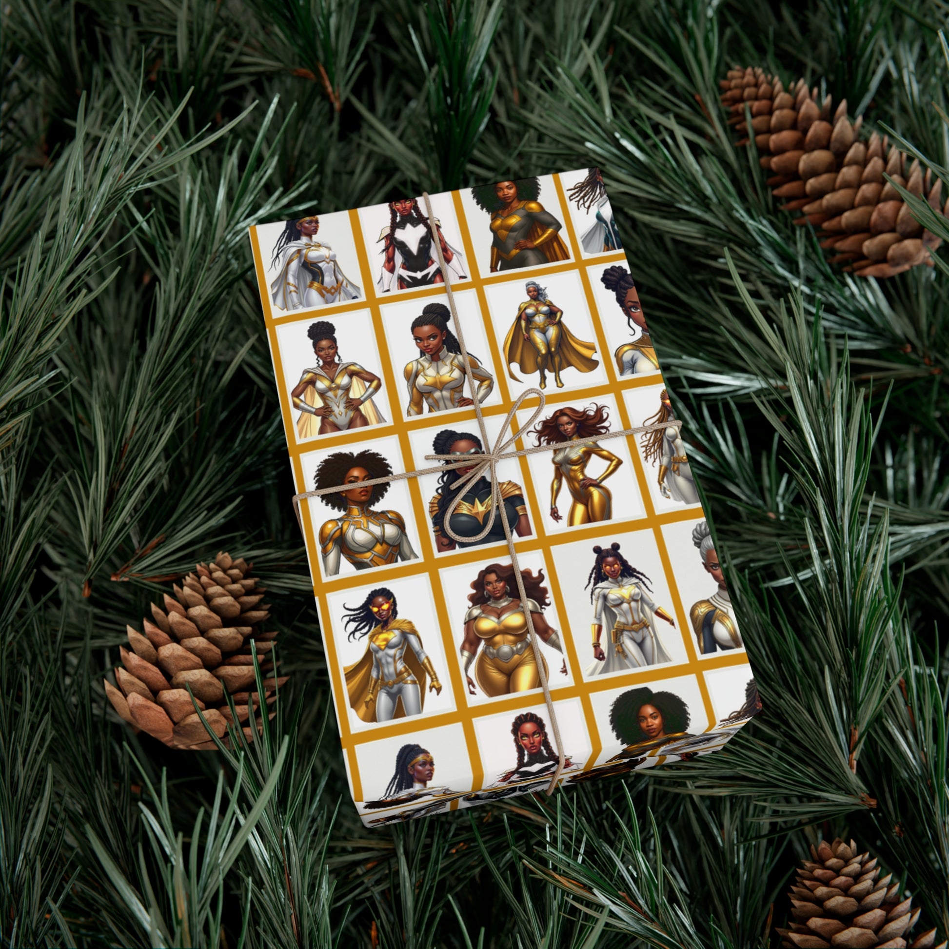 Turn every gift into a statement of power and grace. The I AM A SUPERHERO (GOLD) wrapping paper celebrates the brilliance, courage, and divine energy of 16 stunning Black women superheroes. Each is rendered in radiant gold and white tones that shimmer with confidence.